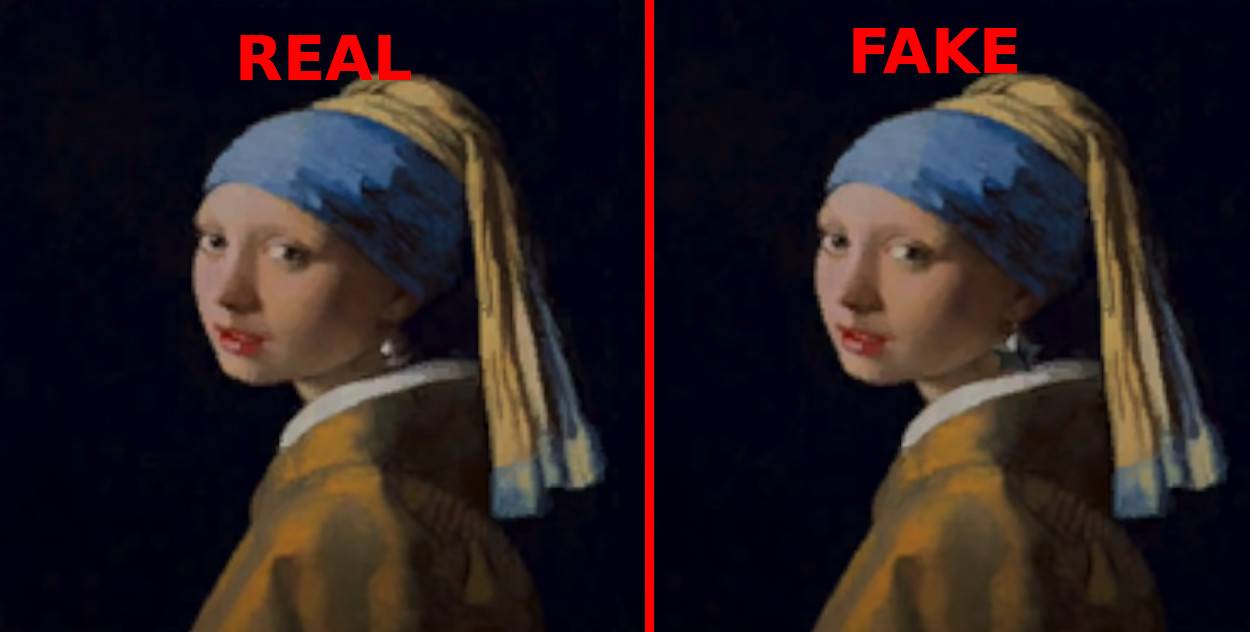 The fake painting has purple flowers while the real one has blue flowers. This video shows you how to determine if this painting is real or fake.